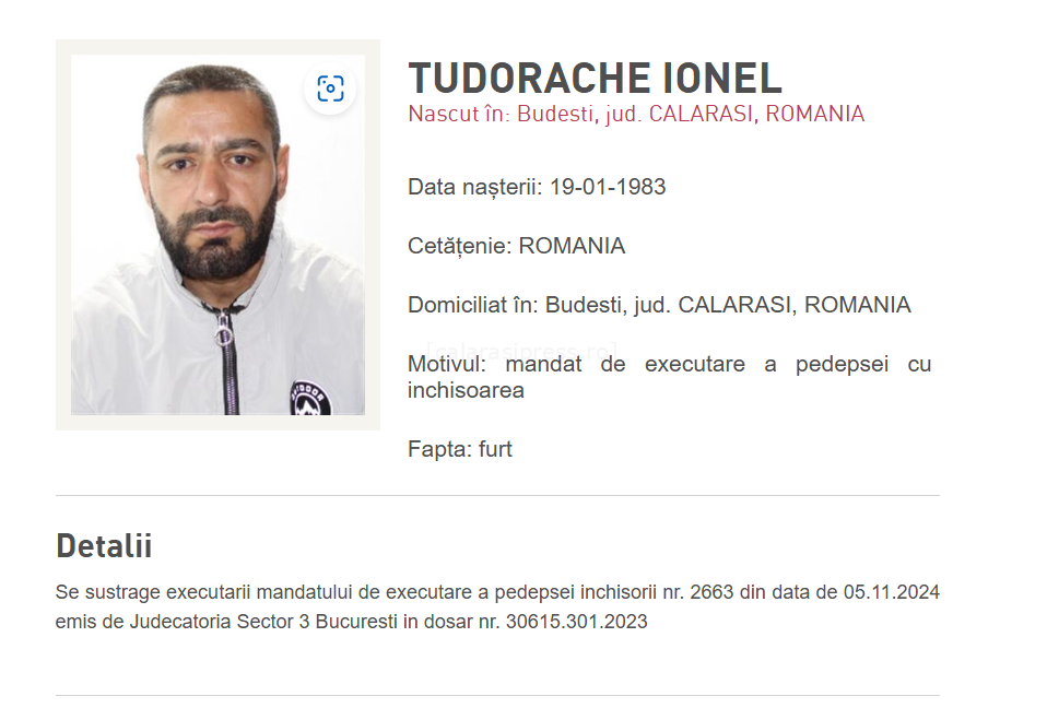Ionel Tudorache, în vârstă de 41 de ani, din orașul Budești, județul Călărași, a fost dat în urmărire națională de autorități, potrivit unui anunț publicat pe site-ul Poliției Române. Bărbatul este căutat de polițiști pentru a fi încarcerat, după ce a fost condamnat la nouă luni de închisoare cu executare. Potrivit dosarului, bărbatul a spart […]